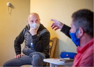 Brian, a health worker in the Providence community in Vala Vala, Washington, talks to a client.