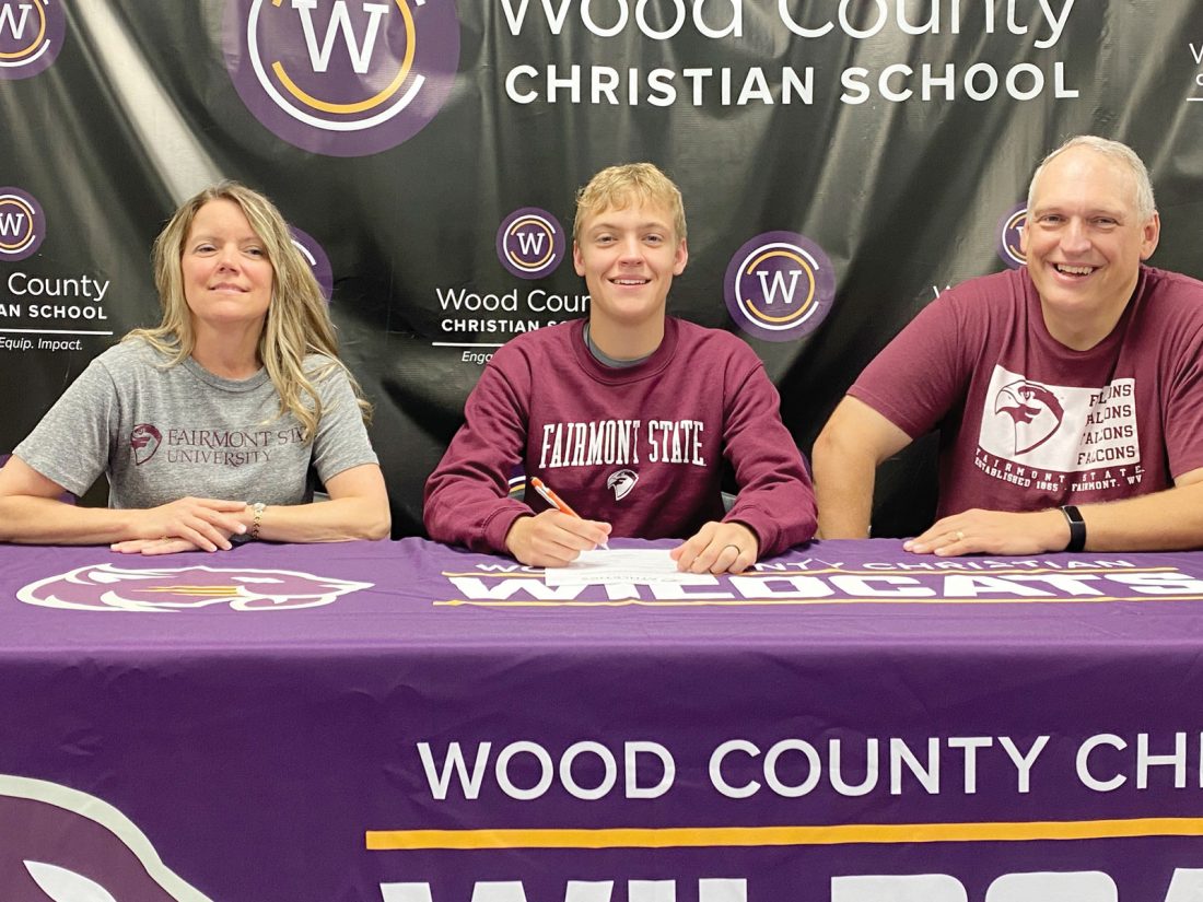 Christian Sr. Ben Wickley, center in Wood County, signed with Fermont State University on Friday to join the cross country school program. Also pictured are his parents, Nicky and Dave Weekly. (Photo by Carrie Patrick)